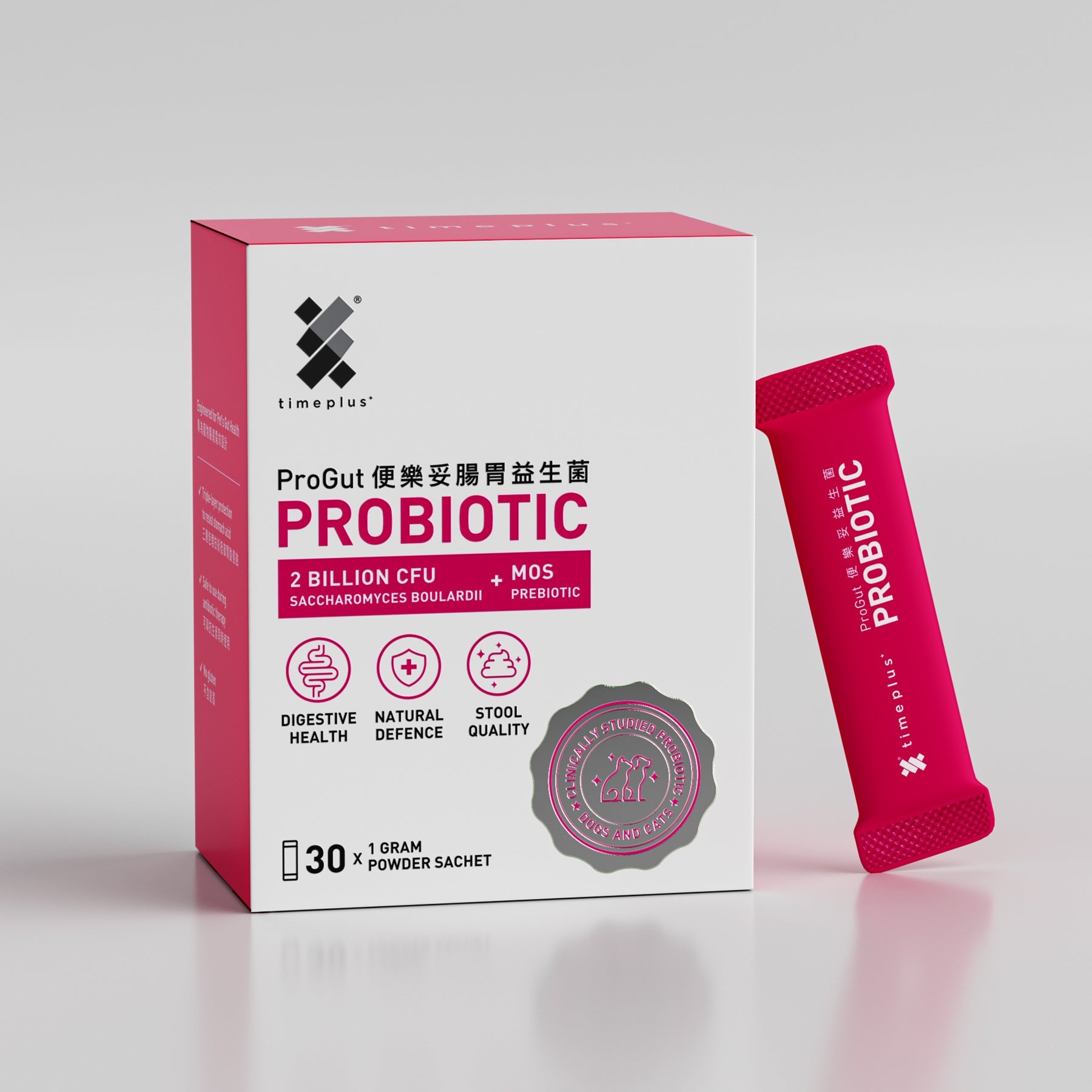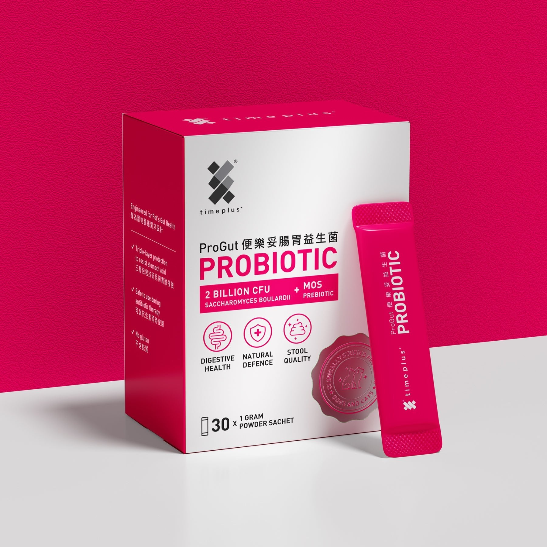Featuring a patented triple-layer coating, Timeplus+ ProGut Probiotic is tough enough to handle your pet's strong stomach acid. Delivers active probiotics to balance their gut microbiome. No more diarrhea or soft stool—just happy tummies. The guardian of your pet's digestive health!